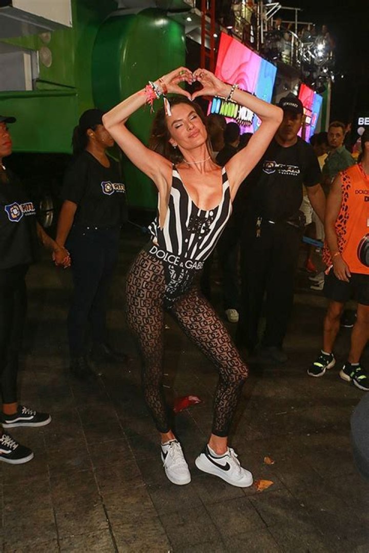 Alessandra Ambrosio never misses an opportunity to live it up in her home country of Brazil. The former Victoria’s Secret supermodel, 41, took to the streets there to dance at Carnival over the weekend in an eye-catching ensemble worthy of her career. In a fun photo taken Saturday, Feb. 18 at a Major Lazer concert in Salvador, the mom of two rocked a black and white striped Dolce & Gabbana swimsuit paired with sheer D&G logo leggings! She finished the ensemble with an assortment of layered boho bracelets, a pair of black and white sneakers, and a simple necklace. Alessandra smiled seductively and closed her eyes as she popped her hip out and mimed a heart over her head. Around her, the annual iconic celebration seemed to be in full swing as she danced.