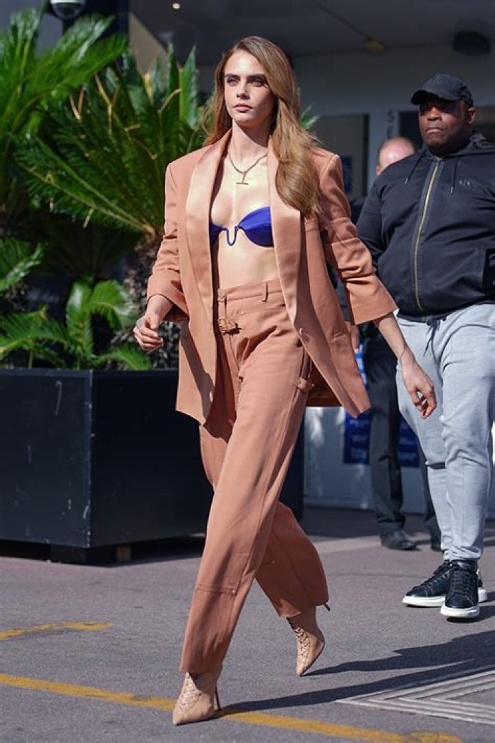 Cara Delevingne put her toned stomach on full display when she rocked a tiny blue bra with a tan suit at a Planet Sex press conference during MIPCOM 2022 in Cannes, France on Oct. 18. The 30-year-old rocked a plunging blue underwire bra with a tan blazer on top, leaving it open to show off ample skin and cleavage.