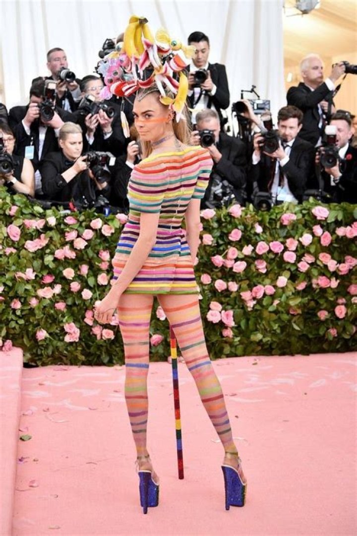 Cara Delevingne Stuns In A Rainbow Romper Outfit & Banana Hat At Met Gala 2019