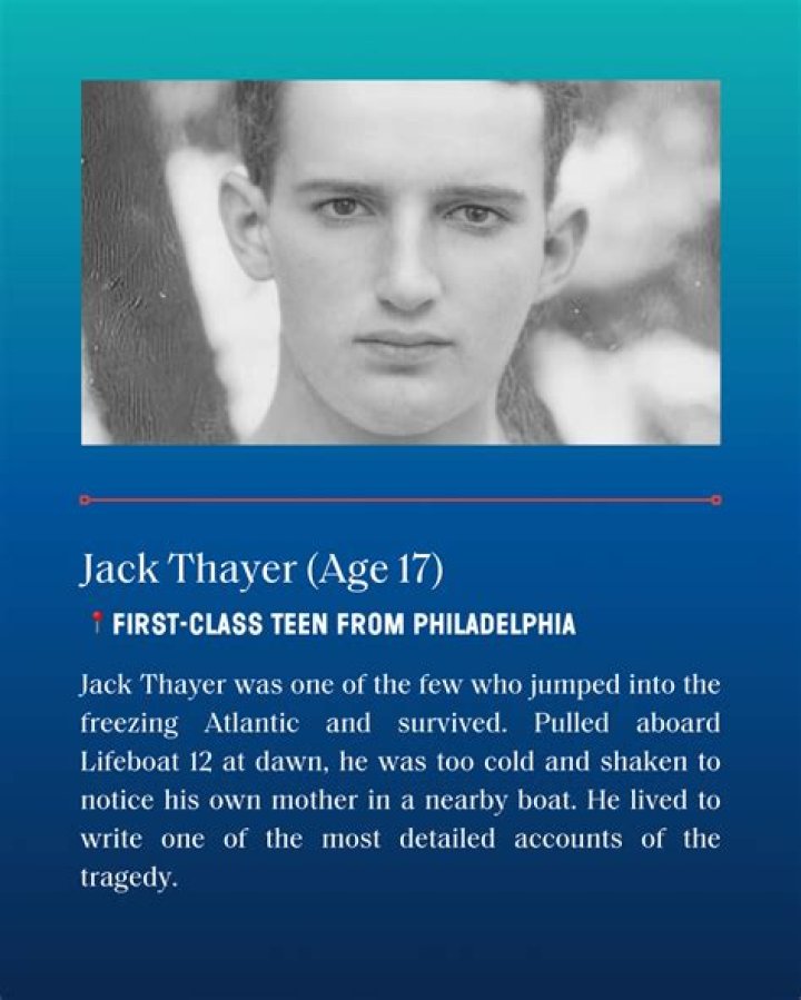 [✎]● Jack Thayer was born on December 24, 1894 (age 50) in Pennsylvania, United States ● He is a Celebrity Titanic Survivor ● He died on September 20, 1945, Philadelphia, PA● The parents of Jack Thayer are John B. Thayer, Marian Thayer● He had 2 children Edward Cassatt Thayer, John B. Thayer IV● His spouse is Lois Cassatt● Jack Thayer has 3 siblings in His family: Pauline Thayer Dolan, Frederick Morris Thayer, Margaret Thayer Talbott● He real name is Jack Thayer