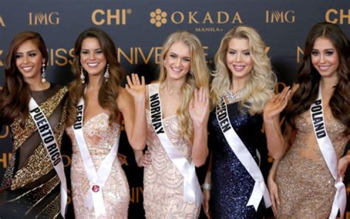 Miss Universe candidates Brenda Azaria Jimenez from Puerto Rico, Valeria Piazza from Peru, Christina Waage from Norway, Ida Ovmar from Sweden, and Izabella Krzan from Poland gesture during the Miss Universe Red Carpet presentation on the eve of the pageant day in Pasay City, south of Manila, Philippines 29 January 2017. (REX/Shutterstock)