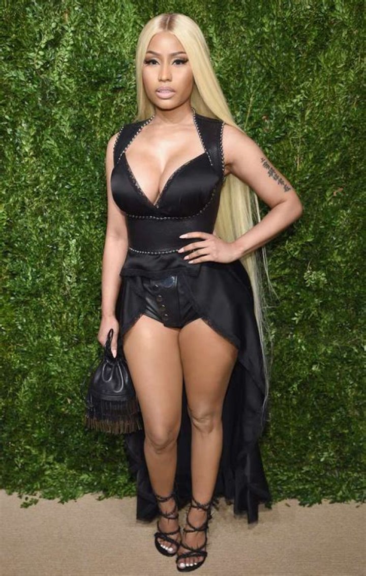 After the event, Nicki changed into a much tamer look. She donned an elegant silky off-white dress that featured a high neck and a bow across the neckline and her waist. The dress also featured a high slit up her left leg.
