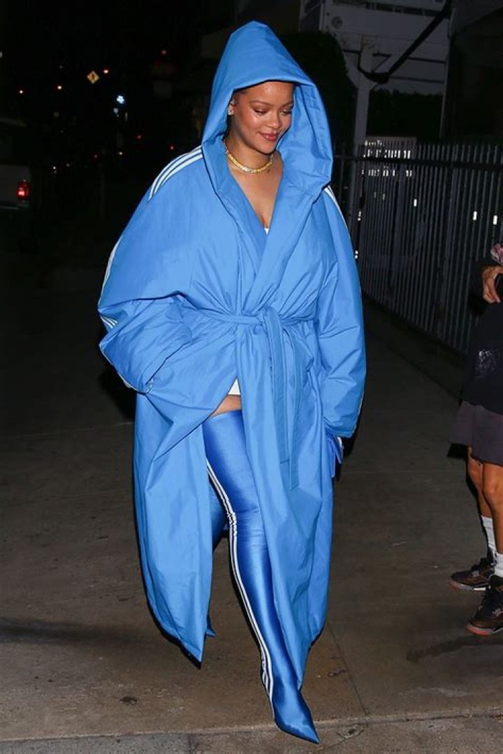 Other than the thigh-high boots, Rihanna rocked a matching, oversized coat. Just like the boots, the coat had the stripes going down the sleeve, and it had a hood, which the “Work” singer had pulled over her head, as she left the restaurant. She went all out for the outfit, with a matching clutch, which had the same design as the shoes and coat. Besides the bright blue Balenciaga outfit, the popstar also accessorized with a gold chain necklace. In some other shots, she was seen wearing white sunglasses.