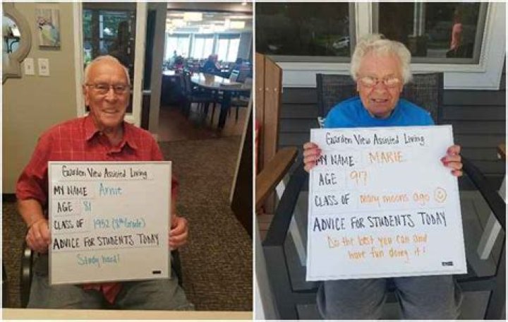 In recent years, parents have been taking first day of school photos of their children proudly holding signs that list their age, their grade, and some of their favorite things. Usually, the answers are under 10, under 5th, and princesses and/or dinosaurs. But the residents of Garden View Assisted Living in Carroll, Iowa, decided to have their own fun and recreate this popular "back-to-school" trend with a very sweet spin. They took pictures holding up a white board featuring their age, the year they graduated, and their advice for students today.