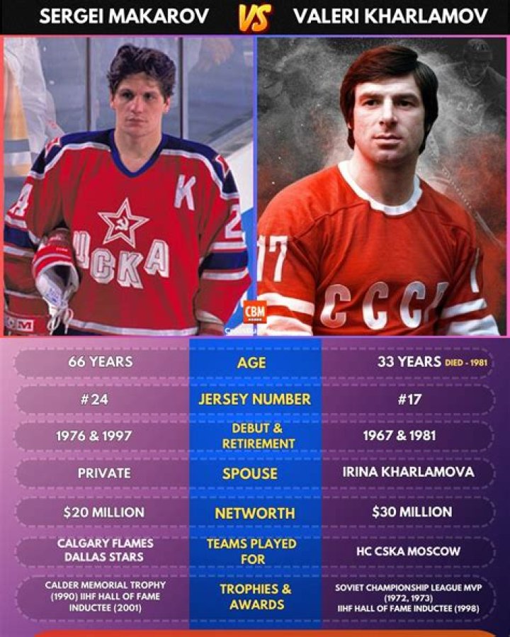 [✎]Valeri Kharlamov was born on January 14, 1948 (age 33) in Russia. He is a Celebrity Hockey Player. Hall of Fame left winger for CSKA Moscow and the Soviet national team who is thought of as one of the greatest hockey players of his time, having won eight World Championships and two Olympic gold medals. His life was cut tragically short after a car accident in August 1981, when he was just 33 years old. According to numerology, Valeri Kharlamov's Life Path Number is 1. He died on August 27, 1981, Solnechnogorsky District, Russia. He had 2 children Aleksandr Kharlamov, Bugonita Kharlamova. His spouse is Irina Kharlamova (m. 1976–1981). His height is 5 ft 8 in (173 cm). More information on Valeri Kharlamov can be found here. This article will clarify Valeri Kharlamov's Youtube, Miracle, Highlights, Wiki, Death, Hall Of Fame, Wikipedia, Autograph, Nhl, Jersey, and other information.