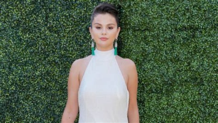 Selena’s slinky white sleeveless dress featured a choker neckline and an open back that tied at the back of her neck. The dress hugged her frame perfectly and she accessorized with bright green and silver fringe tassel earrings, a diamond ring, and bright green nail polish. Her hair was thrown up into a bun while a sultry smokey eye and glossy nude lip completed her look.